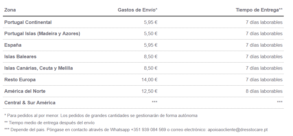 Los valores de envío indicados son para volúmenes de hasta 2 kg. Para volúmenes superiores a 2kg Dress To Care ajustará el valor de los gastos de envío comunicárselo a sus clientes y tras su conformidad.